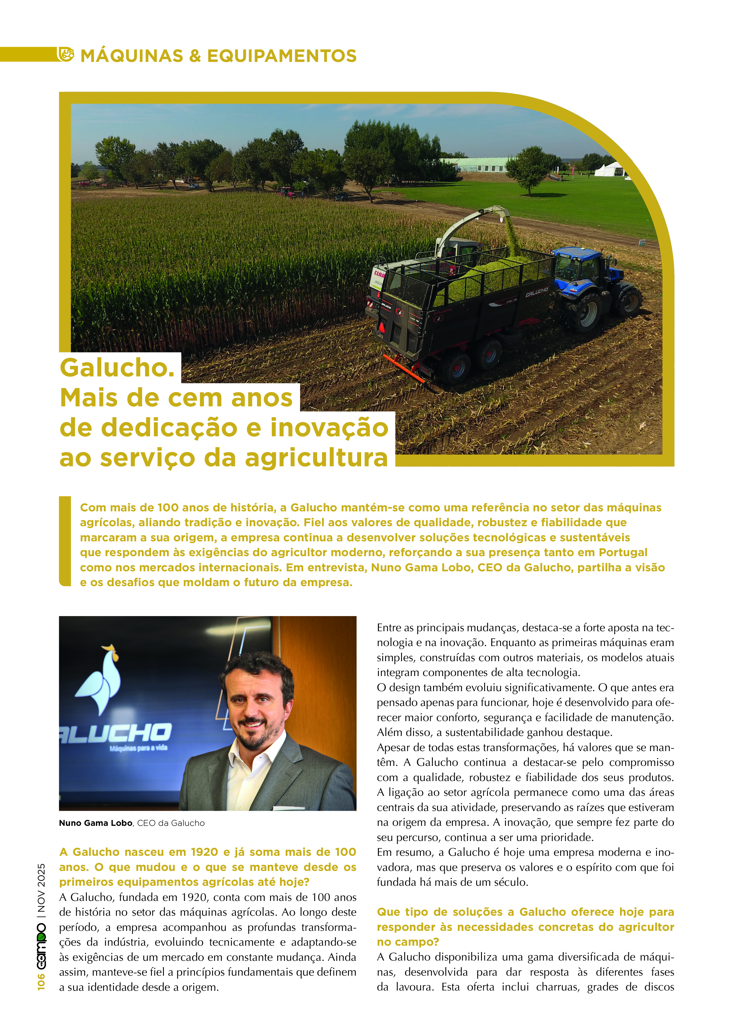 Galucho est présent dans le numéro 297 du magazine Voz do Campo grâce à notre directeur général, Nuno Gama Lobo, qui nous parle de l'évolution de notre gamme agricole, du processus de production et de sa vision des défis et des opportunités pour l'avenir de l'agriculture au Portugal.